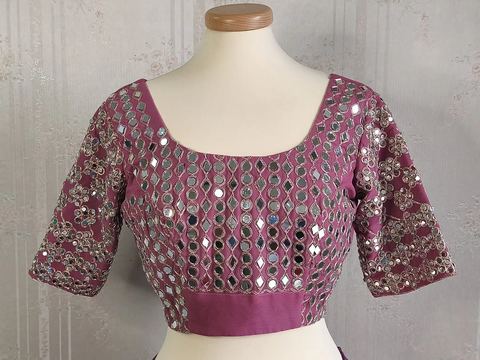 - Camicetta: pronta da indossare | Tessuto: georgette morbida con ricamo e specchio | Colore: Lavanda | Taglia: M - 38", modificabile fino a 42"