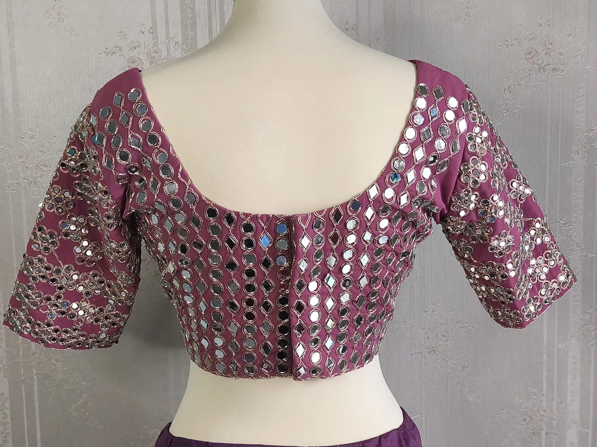 - Camicetta: pronta da indossare | Tessuto: georgette morbida con ricamo e specchio | Colore: Lavanda | Taglia: M – 38″, modificabile fino a 42″
