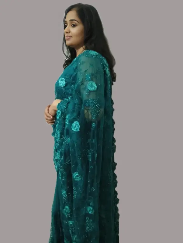 Aggiungi un tocco di eleganza e raffinatezza al tuo look da festa con questo splendido saree in rete verde acqua blu. Impreziosito da ricami floreali delicati e applicazioni 3D a forma di rosa, questo capo unisce perfettamente tradizione e glamour. Il tessuto in rete dona leggerezza e grazia, mentre il bordo riccamente decorato valorizza l’intero design.