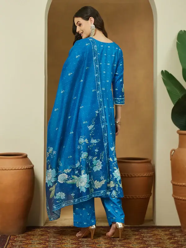 Set Anarkali Kurta con stampa floreale in misto cotone blu