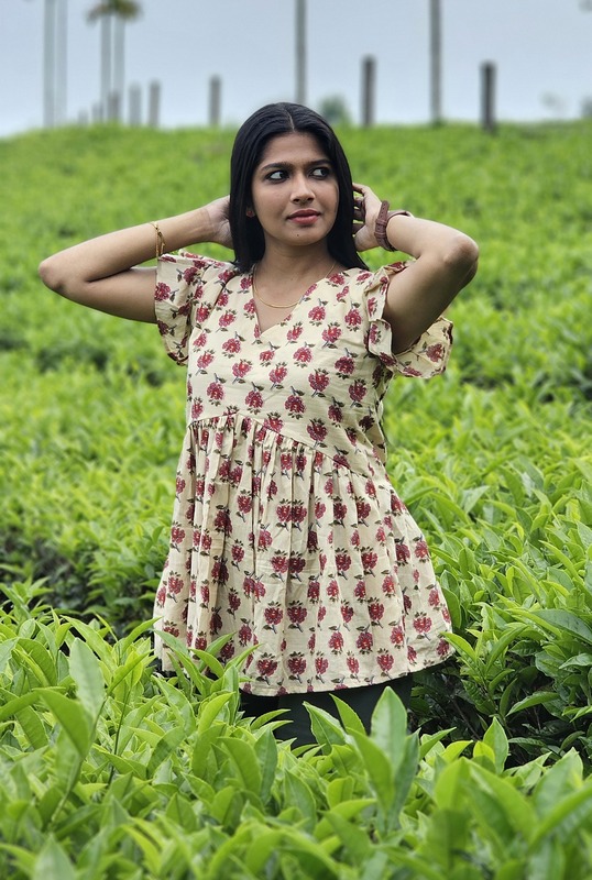 Realizzato a mano in puro cotone indiano. leggero e traspirante, impreziosito da delicate stampe floreali, presenta romantiche maniche a volant e una silhouette svasata che dona movimento ed eleganza naturale alla figura.