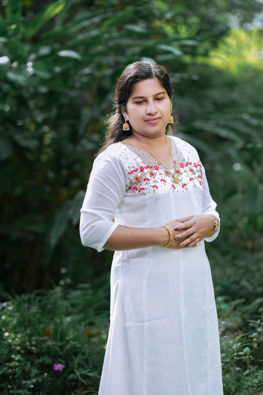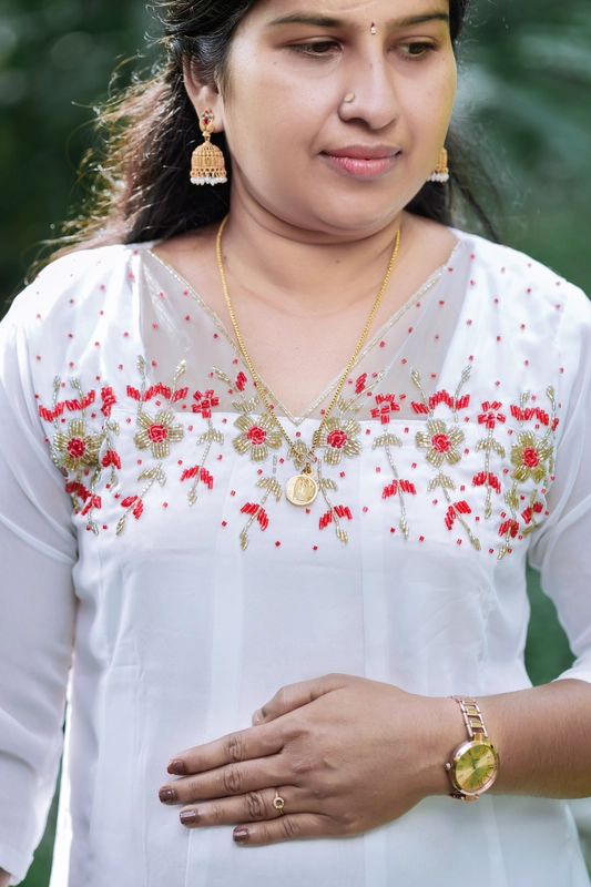 - Tessuto: Georgette | Svasato | Splendida lavorazione a mano sul giogo | Scollo a V con motivo a rete, perline e lavorazione Zari | Fodera inclusa