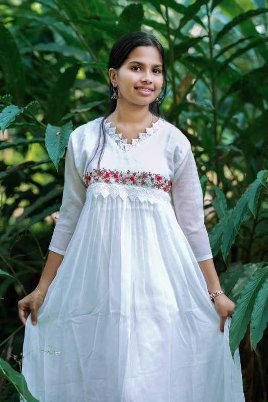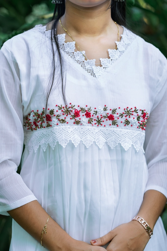 - Tessuto: georgette | Svasato | Splendida lavorazione a mano sul carré | Scollo a V con pizzo, perline e lavorazione zari | Fodera inclusa