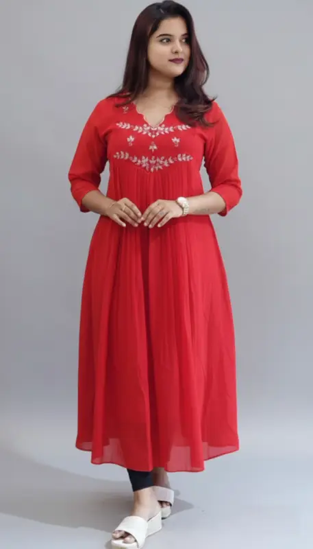 - Tessuto: georgette | Svasato, Taglio dell’ombrello | Splendida lavorazione a mano sul carré | Scollo a V, perline e lavorazione zari | Fodera inclusa